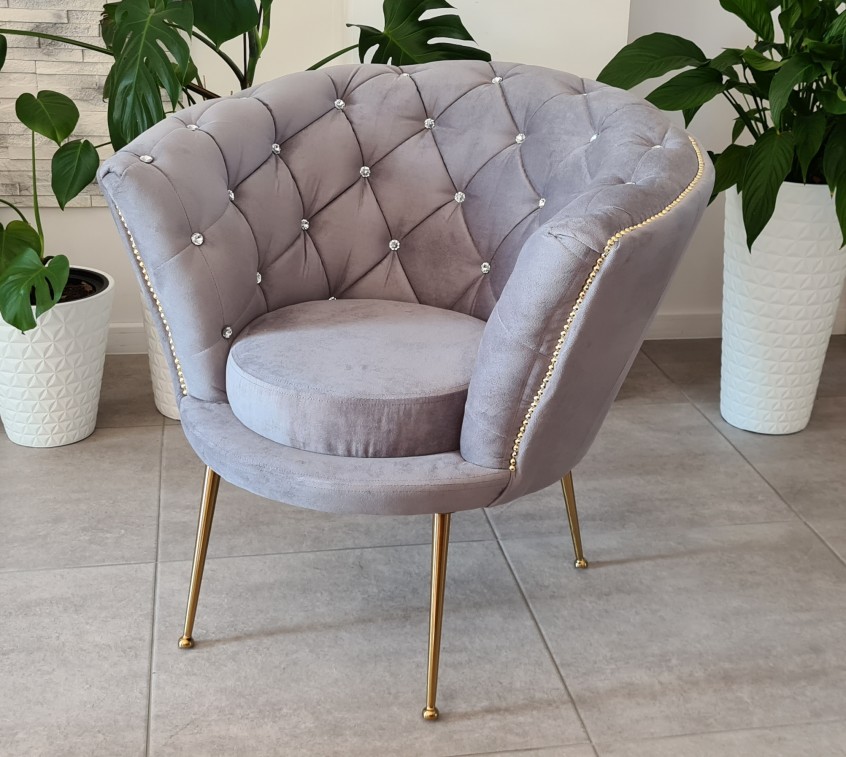 FOTEL MUSZELKA PIKOWANA GUZIKAMI W WYBRANYM KOLORZE Z PROSTYMI ZŁOTYMI NÓŻKAMI chesterfield