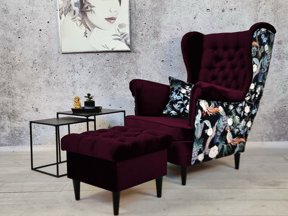 FOTEL USZAK Z PODNÓŻKIEM W STYLU CHESTERFIELD W DOWOLNYM WYBRANYM KOLORZE Z PROSTYMI NÓŻKAMI GŁĘBOKO PIKOWANY GUZIKAMI W GĘSTE KARO