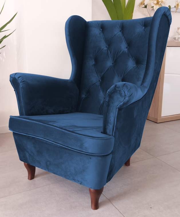 PIĘKNY DUŻY SOLIDNY FOTEL SKANDYNAWSKI NOBI USZAK W DOWOLNYM WYBRANYM KOLORZE Z NÓZKAMI TYPU LUDWIK GŁĘBOKO PIKOWANY W KARO GUZIKI