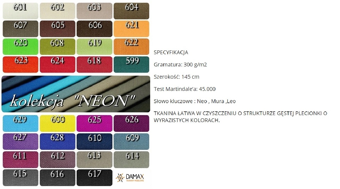 W ofercie posiadamy 9 kolekcji tkanin w tym (neon, sawana oraz suedin w cenie). Kolekcje, zostały wybrane po szczegółowej kontroli. Tkaniny są bardzo wytrzymałe, odporne na ścieranie a przede wszystkim PLAMOODPORNE.