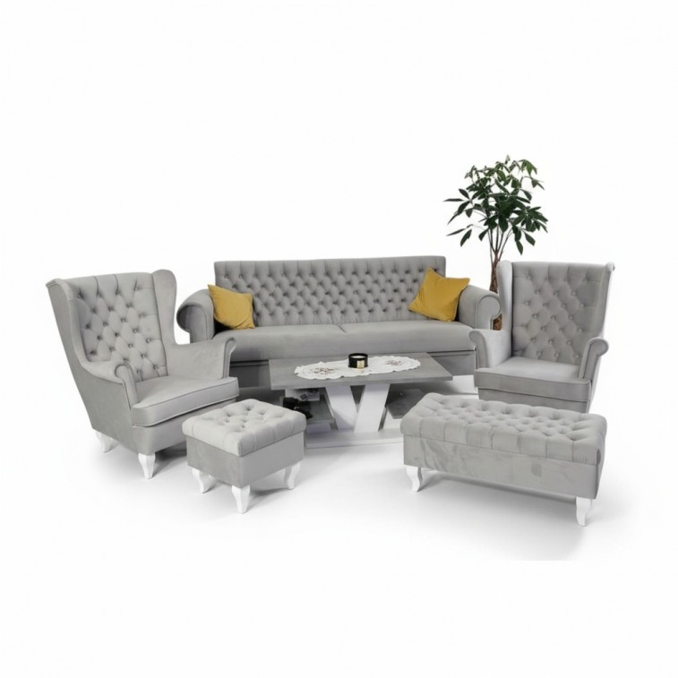 ZESTAW WYPOCZYNKOWY SOFA ROZKŁADANA + FOTEL PIKOWANY Z PODNÓŻKIEM