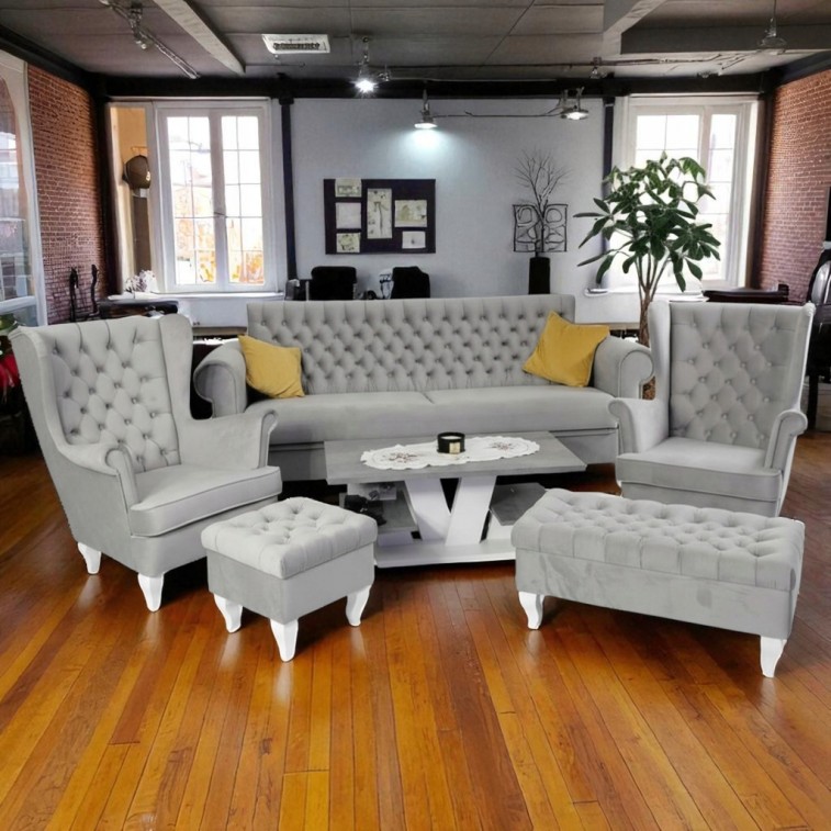PIĘKNY DUŻY ZESTAW CHESTERFIELD GLAMOUR SOLIDNA KANAPA ROZKŁĄDANA 3 OSOBOWA + 2 FOTELE USZAK + 2 PODNÓŻKI W WYBRANYM KOLORZE Z DREWNIANYMI BIAŁYMI NÓŻKAMI W KSZTAŁCIE STOŻKÓW WZÓR PIKOWANIA GŁEBOKIE PIKI KARO GUZIKI