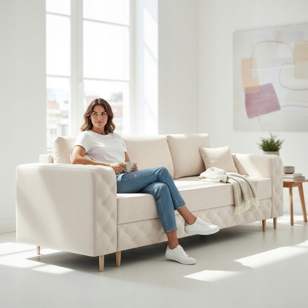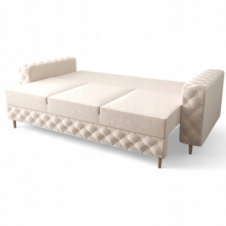 DUŻA ROZKŁADANA KANAPA COMO W KOLORZE KREMOWYM Z DREWNIANYMI NÓŻKAMI WZÓR PIKOWANIA KARO GUZIKI