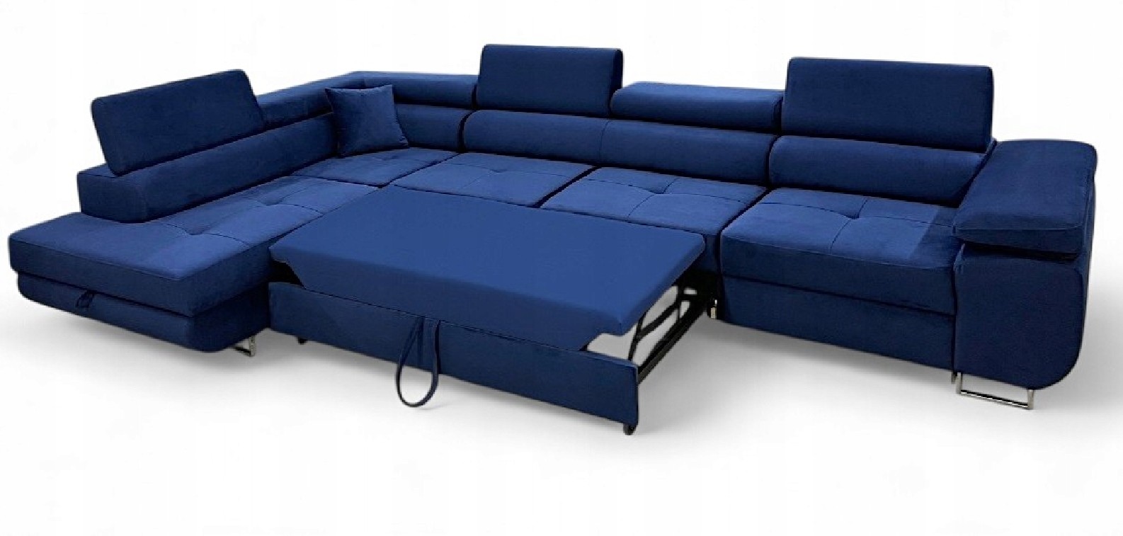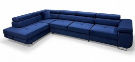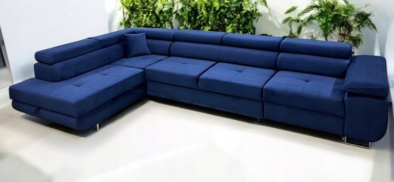 Narożnik ANTOS L posiada funkcję spania oraz pojemnik na pościel. Nogi w narożniku zastosowano chromowe. Narożnik posiada 4 regulowane zagłówki, ozdobne przeszycia oraz piki na siedzisku.
