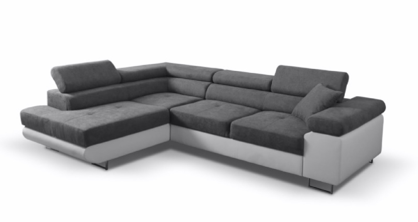 Narożnik ANTOŚ posiada funkcję spania oraz dwa pojemniki na pościel. Nogi w narożniku zastosowano chromowe. Narożnik posiada 3 regulowane zagłówki, ozdobne przeszycia oraz piki na siedzisku.