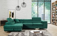 Narożnik ANTOS posiada funkcję spania oraz pojemnik na pościel. Nogi w narożniku zastosowano chromowe. Narożnik posiada 3 regulowane zagłówki, ozdobne przeszycia oraz piki na siedzisku.