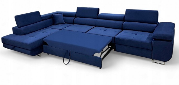 Narożnik ANTOŚ posiada funkcję spania oraz dwa pojemniki na pościel. Nogi w narożniku zastosowano chromowe. Narożnik posiada 3 regulowane zagłówki, ozdobne przeszycia oraz piki na siedzisku.