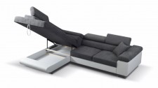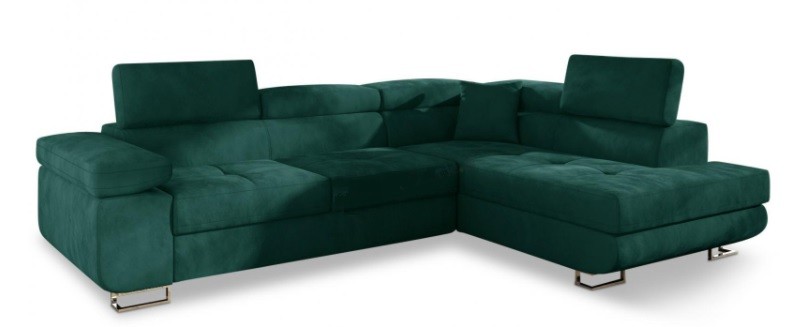 Narożnik posiada funkcję spania oraz pojemnik na pościel. Nogi w narożniku zastosowano chromowe. Narożnik posiada 3 regulowane zagłówki, ozdobne przeszycia oraz piki na siedzisku.