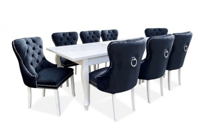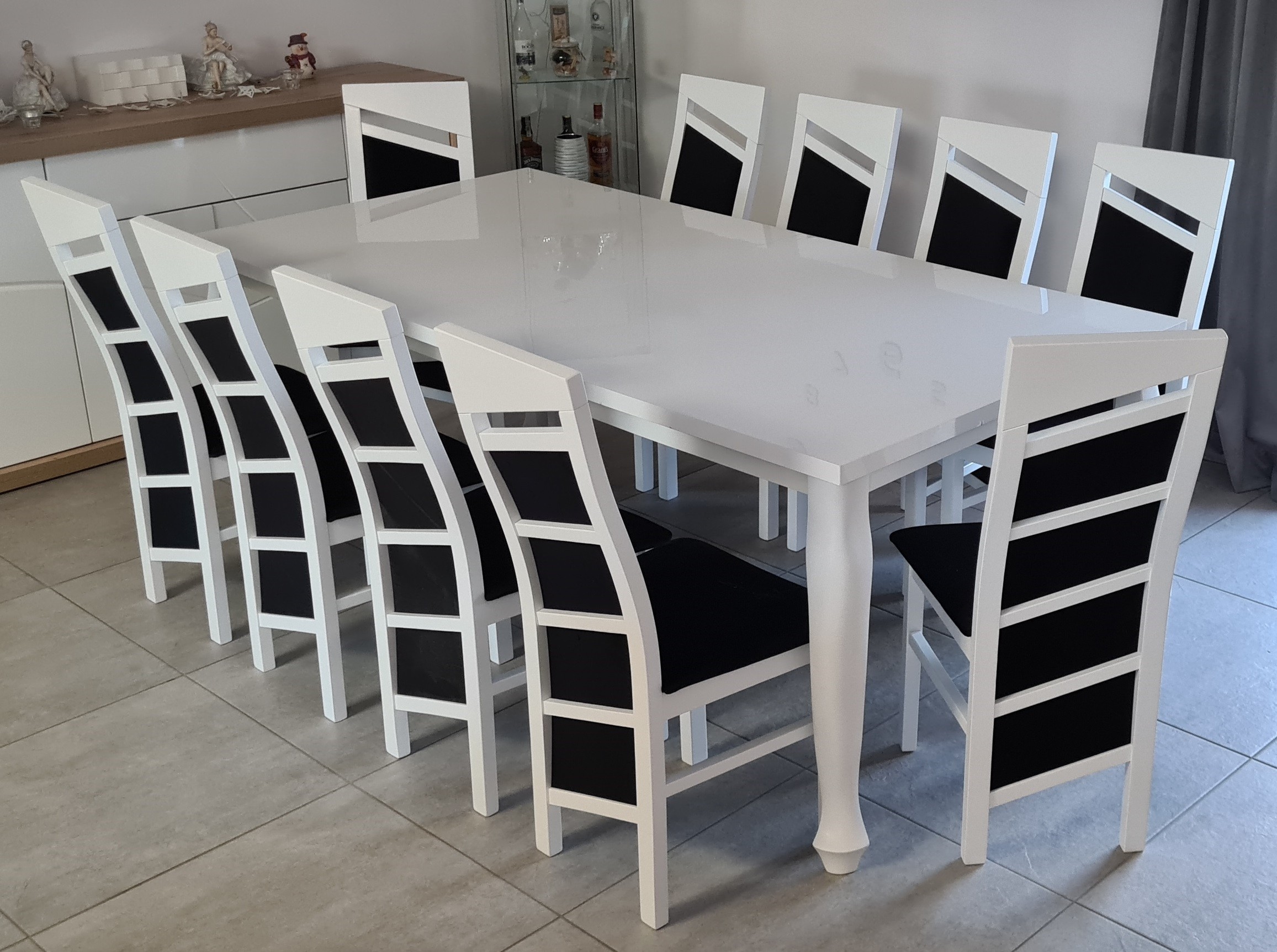 Piękny BIAŁY ZESTAW do salonu stół rozkładany MST-8 100x200+2x50 wkładka długość po rozłożeniu 250/300cm i 10 krzeseł CHIŃCZYK z litego drewna bukowego.