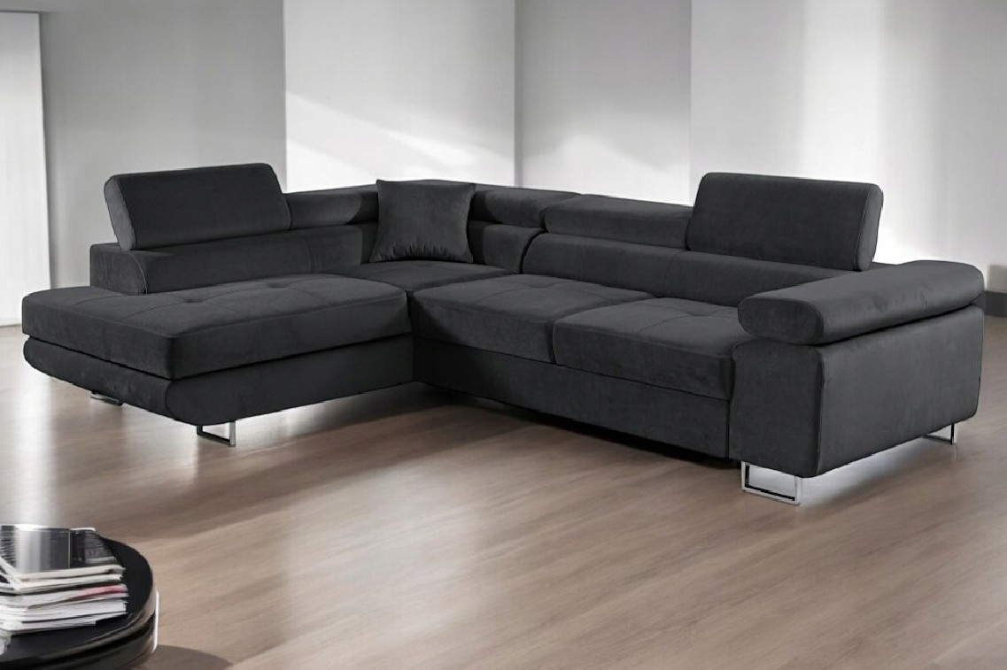 Narożnik ANTOS L posiada funkcję spania oraz pojemnik na pościel. Nogi w narożniku zastosowano chromowe. Narożnik posiada 4 regulowane zagłówki, ozdobne przeszycia oraz piki na siedzisku.