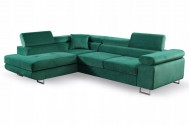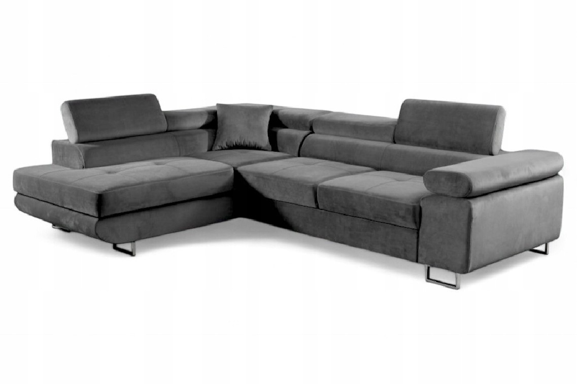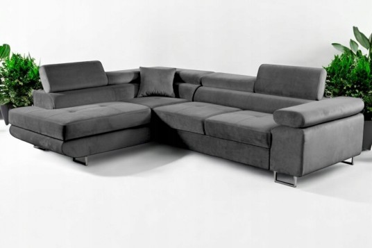 Narożnik ANTOS L posiada funkcję spania oraz pojemnik na pościel. Nogi w narożniku zastosowano chromowe. Narożnik posiada 4 regulowane zagłówki, ozdobne przeszycia oraz piki na siedzisku.
