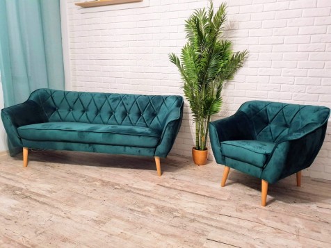Kanapa MOLLI CHESTERFIELD -NOWOŚĆ wykonany na stelażu z litego drewna bukowego. Nóżki wykonane są z najwyższej jakości surowca - drewna bukowego. Siedzisko kanapy wykonane na sprężynach falistych oraz piance wysoko elastycznej HR.