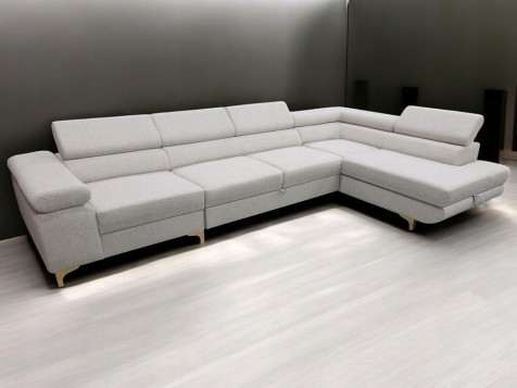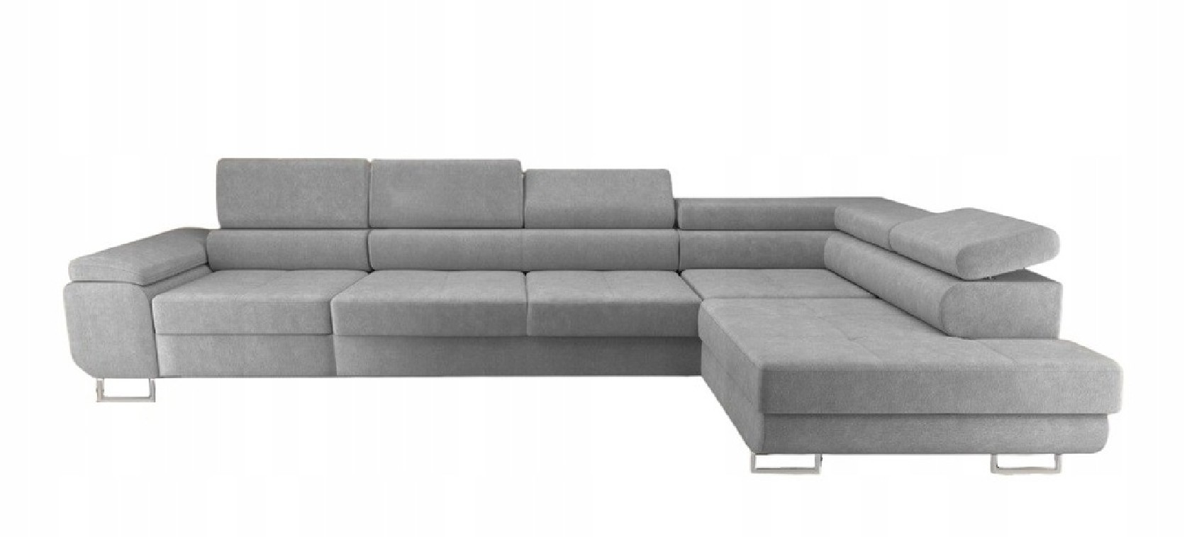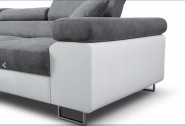Narożnik ANTOS L  posiada funkcję spania oraz pojemnik na pościel. Nogi w narożniku zastosowano chromowe. Narożnik posiada 4 regulowane zagłówki, ozdobne przeszycia oraz piki na siedzisku.