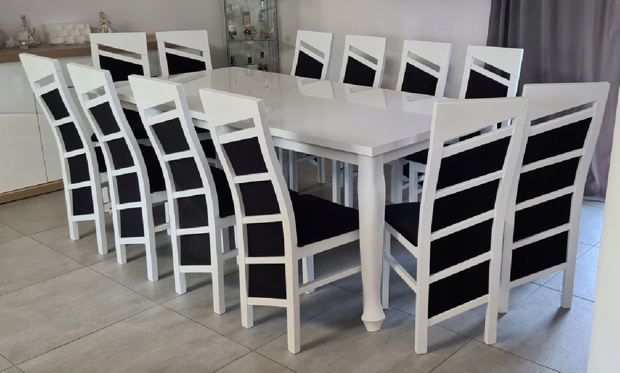 Piękny BIAŁY ZESTAW Stół rozkładany MST-8 100x200+2x50 wkładka długość po rozłożeniu 250/300cm i 12 krzeseł SKOS z litego drewna bukowego.