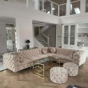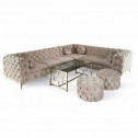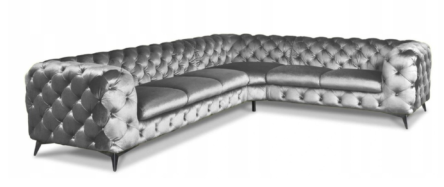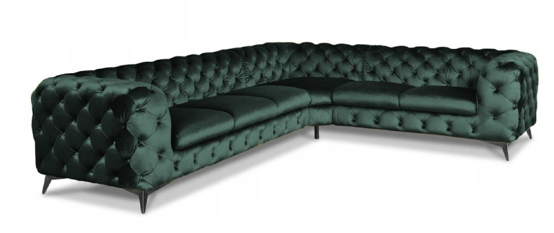 Narożnik Chesterfield + 2 pufy pikowane to prawdziwa innowacja i idealny produkt dla tych, którzy cenią sobie nowoczesne wzornictwo w mieszkaniu. Nóżki wykonane ze stali nierdzewnej na wysoki połysk przez co podkreślają współczesny styl Chesterfield. Głębokość osadzenia siedziska wynosi 64 cm dzięki czemu siedzenie jest bardzo komfortowe. Wysoki poziom komfortu siedzenia zapewnia również to, że w narożniku zastosowano wysokiej jakości piankę komfort wypełniającą, która dostosowuje się do kształtu ciała oraz sprężyny. Masywność bukowej ramy zapewnia stabilność i wytrzymałość konstrukcji.