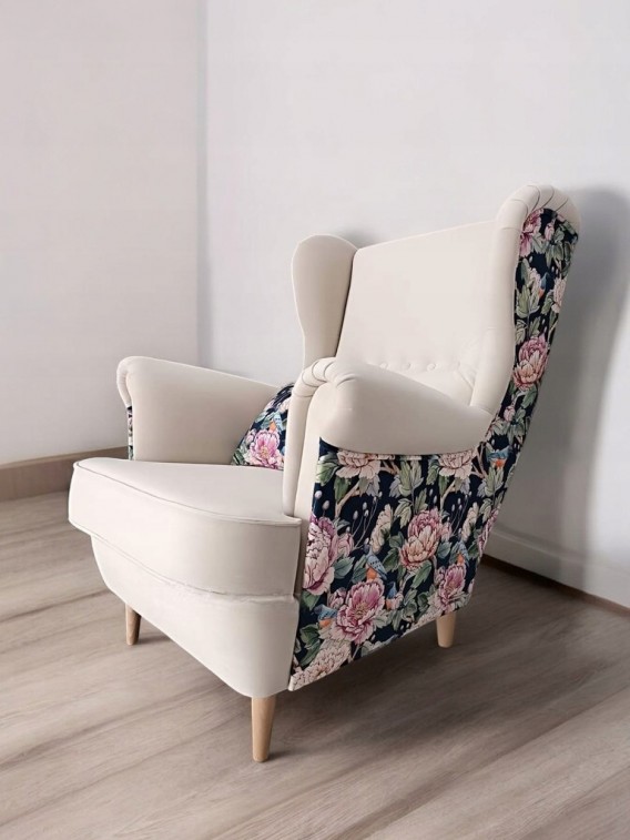 FOTEL USZAK W WYBRANYM MATERIALE Z PROSTYMI NÓŻKAMI PIKOWANY GUZIKAMI KLASYCZNIE