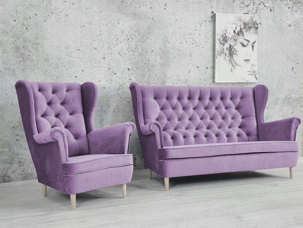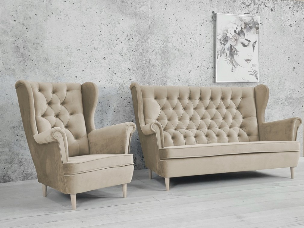 KOMPLET WYPOCZYNKOWY SOFA PIKOWANA USZAK III Z FOTELEM USZAK STYL GLAMOUR
