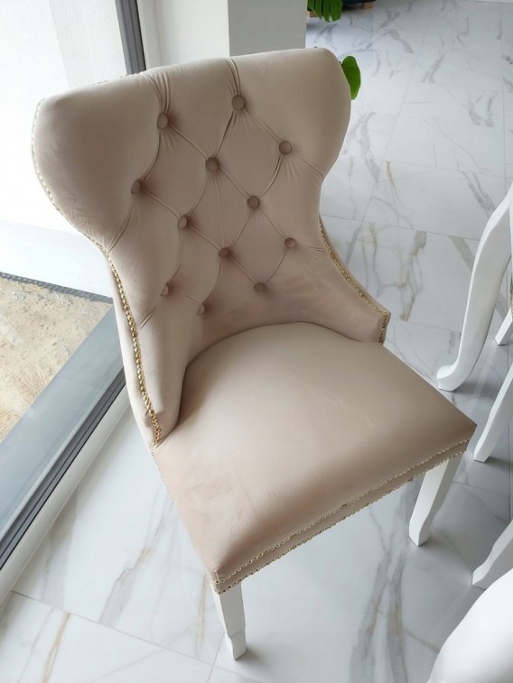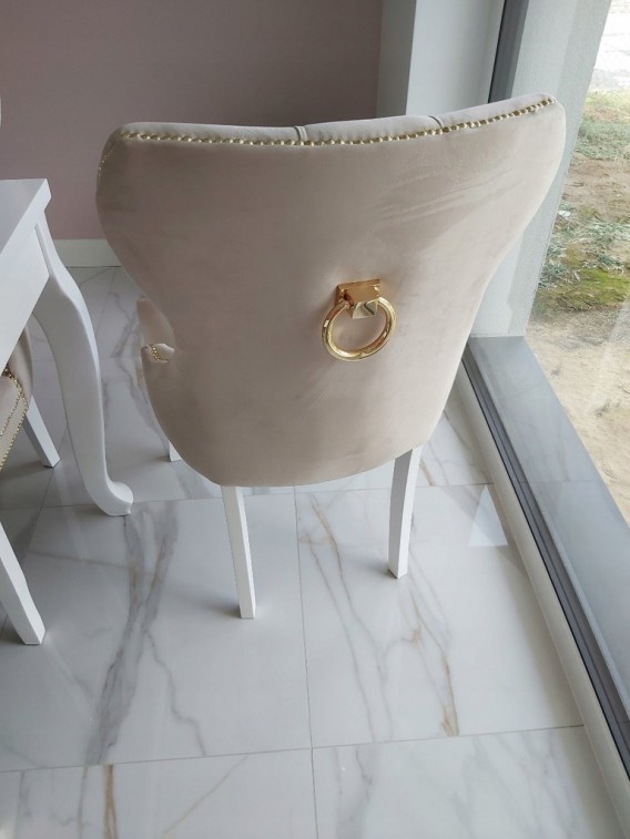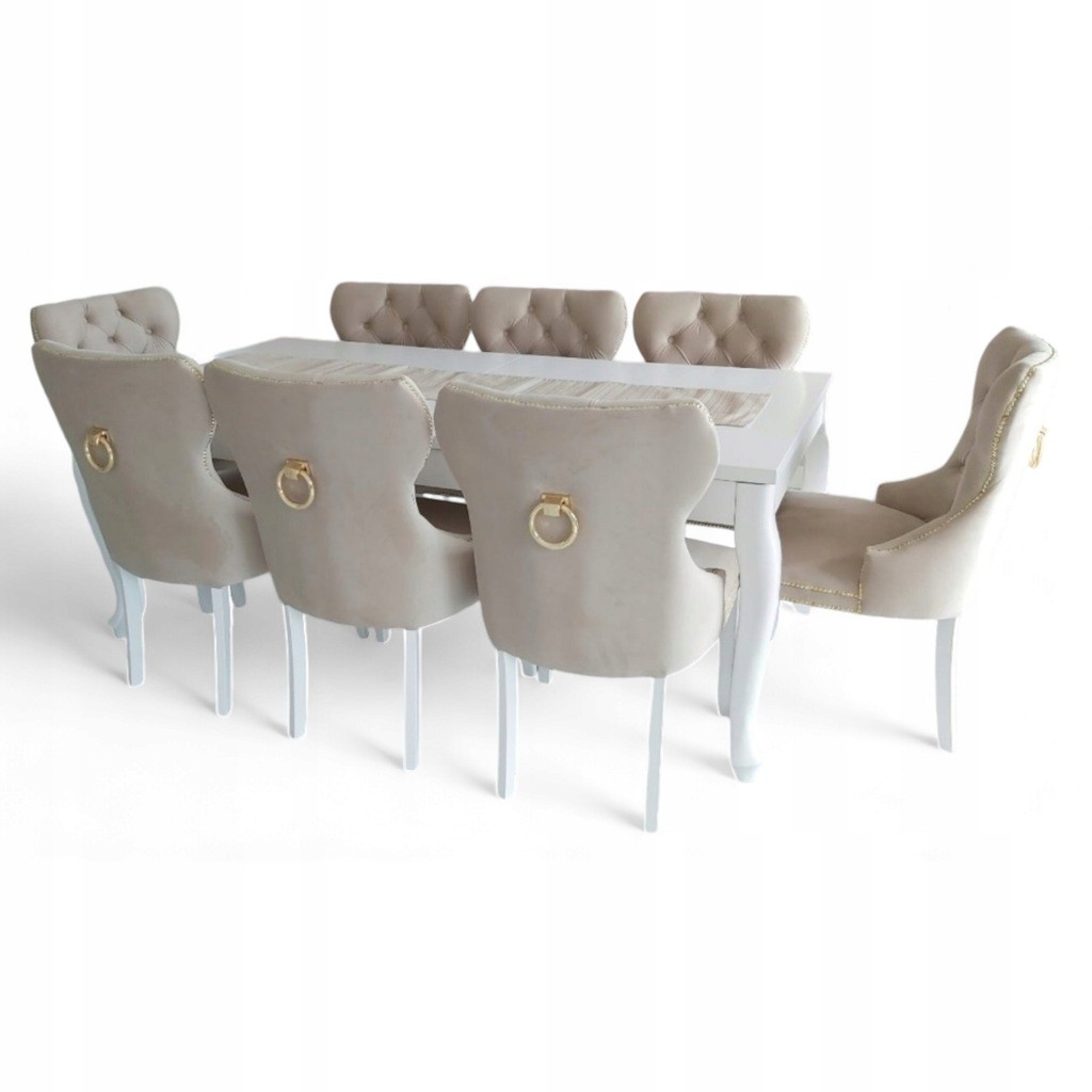 PIĘKNY ZESTAW GLAMOUR Stół rozkładany BIAŁY LUDWIK MST-8 100x250/350 +2x50cm długość po rozłożeniu 300/350cm i 8 krzeseł tapicerowanych ze złotą kołatką i pinezkami w stylu GLAMOUR MADAME .