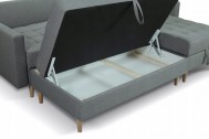 Nie tylko wyrazistym, ale i funkcjonalnym dodatkiem do narożnika jest duża pufa. Dosuwając ją do narożnika zyskujemy dodatkową powierzchnię siedziska. Co więcej - pufa oraz narożnik posiada przestronny schowek, który sprawdzi się jako pojemnik na pościel.