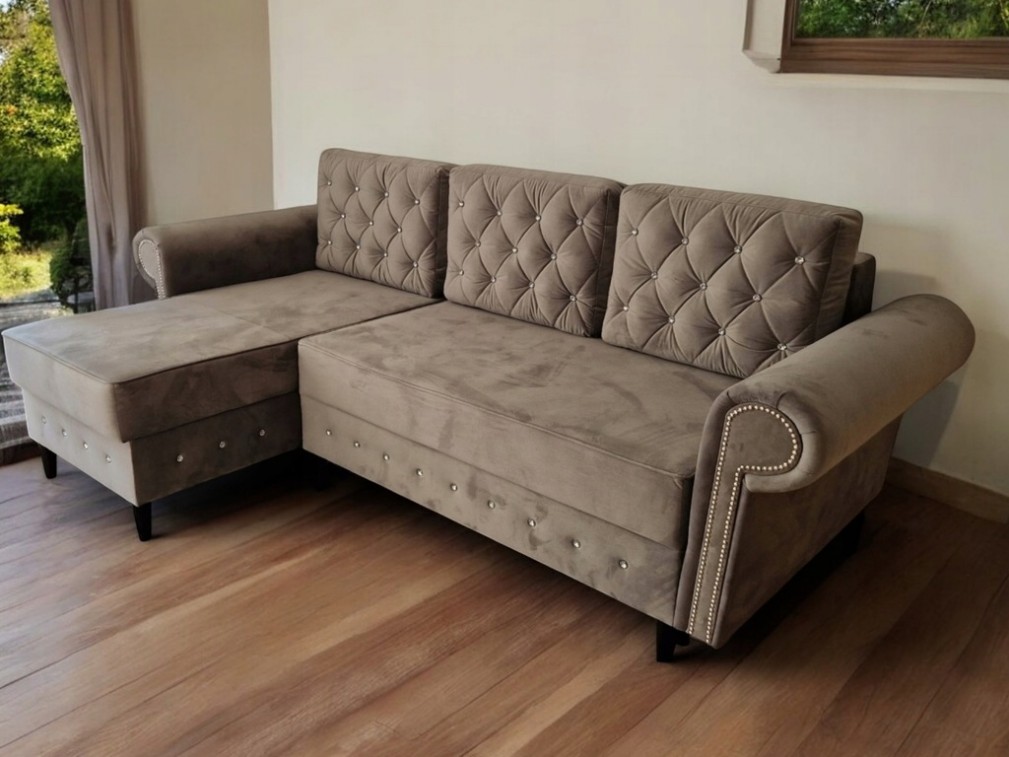 Produkt jest idealnym sposobem na nadanie w Twoim domu estetycznego , a zarazem luksusowego stylu GLAMOUR! Mebel poza praktyczną funkcją spania posiada pojemnik na pościel oraz mechanizm ułatwiający rozkładanie DL. Wygodę podczas użytkowania zapewni nam wysokoelastyczna pianka HR45 oraz sprężyny faliste, a poduszki oparciowe pozwolą na dogodną pozycję dla naszego kręgosłupa. Wychodząc naprzeciw wymaganiom naszych klientów, przygotowaliśmy szeroki wybór tkanin tapicerskich i nóżek. Dzięki temu dopasujecie narożnik tak, by idealnie pasował do aranżacji wnętrza