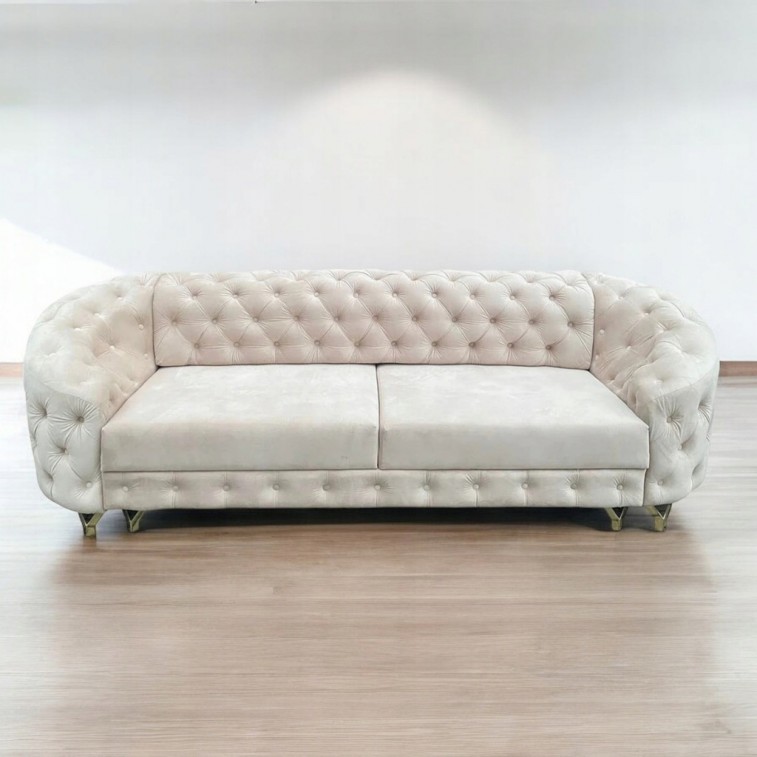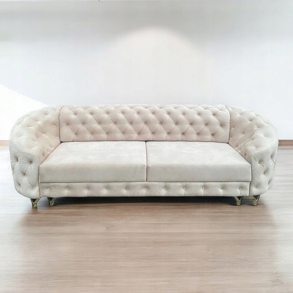 PIĘKNA SOLIDNA KANAPA MOLLI II OSOBOWA W KOLORZE BEŻOWYM Z DREWNIANYMI PROSTYMI NÓŻKAMI W KSZTAŁCIE STOŻKÓW WZÓR PIKOWANIA GŁĘBOKI PIK W STYLU CHESTERFIELD