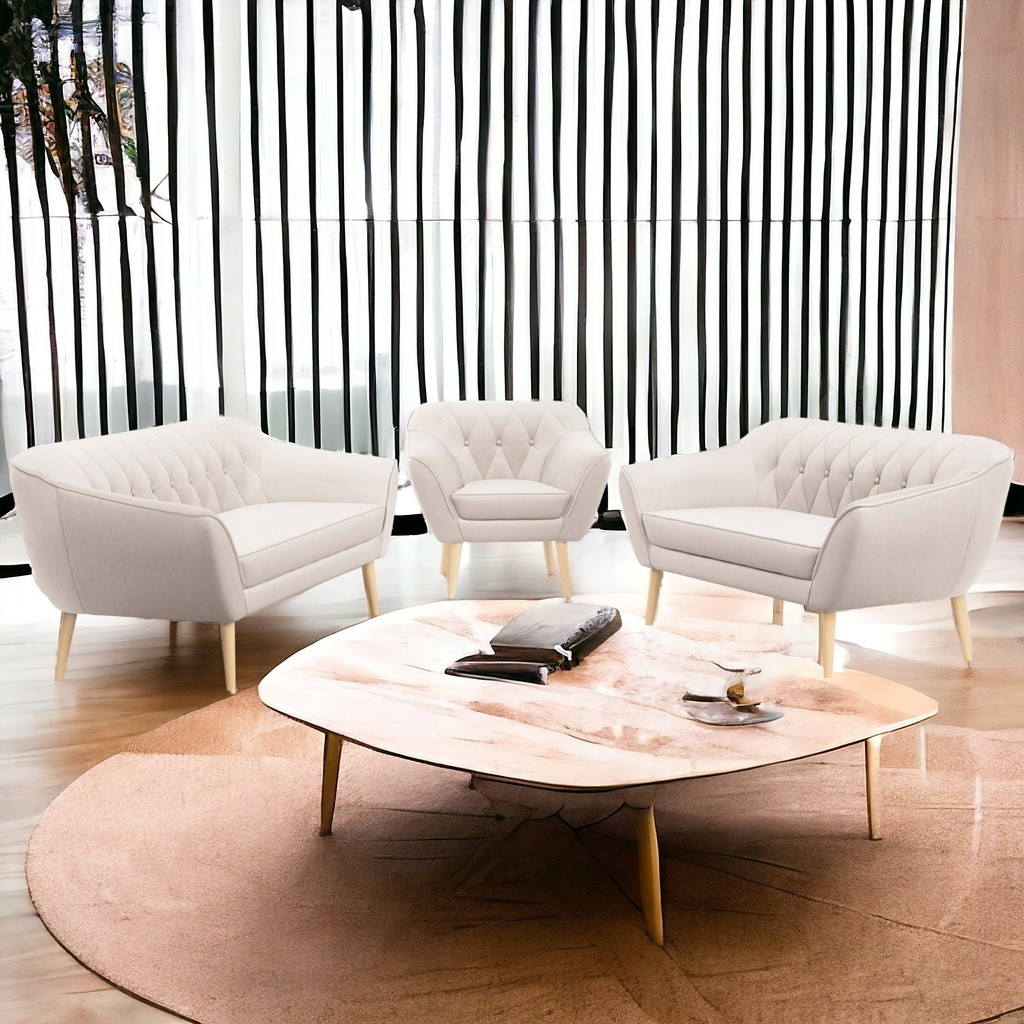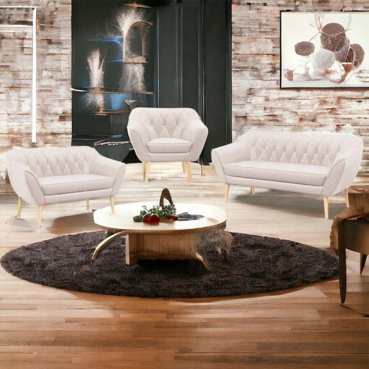 SOLIDNE 2 SOFY MAYA + FOTEL W KOLORZE BEŻOWYM Z DREWNIANYMI NÓŻKAMI W NATURALNYM KOLORZE WZÓR PIKOWANIA OPARCIA ROMBY