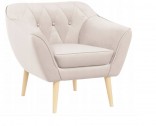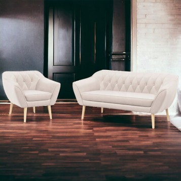 SOLIDNA SOFA DWUOSOBOWA MAYA + FOTEL W KOLORZE BEŻOWYM Z DREWNIANYMI NÓŻKAMI W NATURALNYM KOLORZE WZÓR PIKOWANIA OPARCIA ROMBY