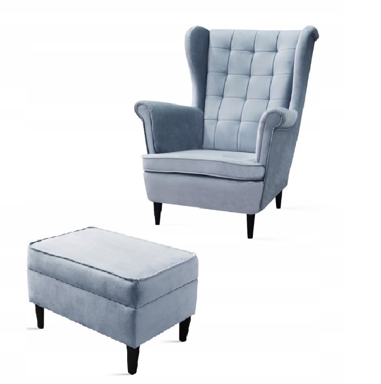 FOTEL USZAK WE WCIĄGI W 4 KOLORACH OD RĘKI Z PROSTYMI DREWNIANYMI NÓŻKAMI WZÓR PIKOWANIA WCIĄGI. + PODNÓŻEK ZE SCHOWKIEM