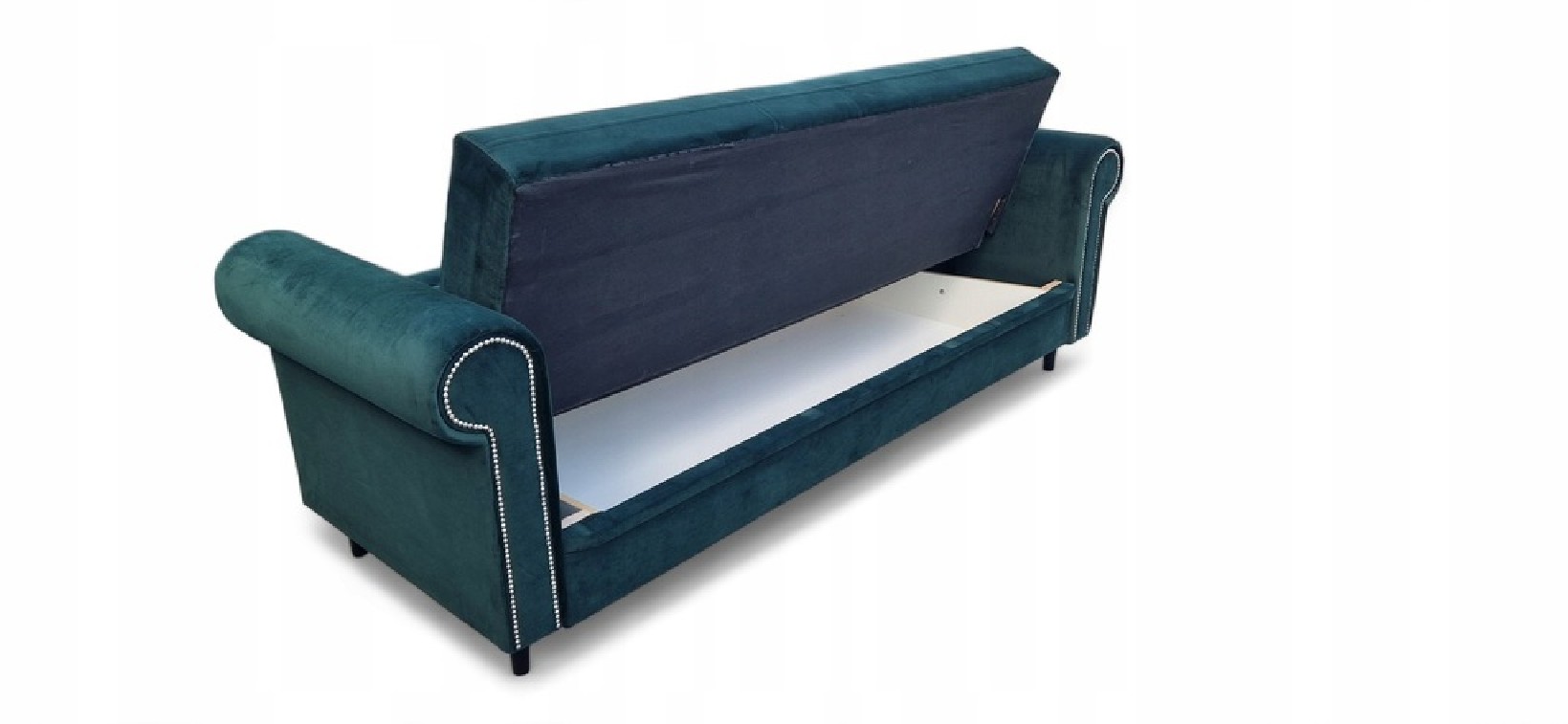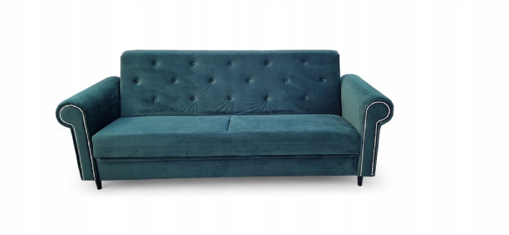 KANAPA PIKOWANA CLIO Z FUNKCJĄ SPANIA I POJEMNIKIEM NA POŚCIEL W KOLORZE BUTELKOWEJ ZIELENI Z DREWNIANYMI NÓŻKAMI WZÓR PIKOWANIA OPARCIA KARO GUZIKI