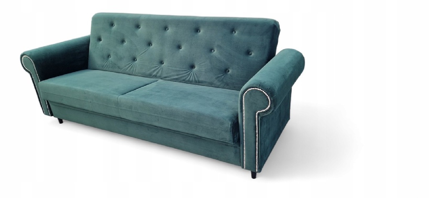 KANAPA PIKOWANA CLIO Z FUNKCJĄ SPANIA I POJEMNIKIEM NA POŚCIEL W KOLORZE BUTELKOWEJ ZIELENI Z DREWNIANYMI NÓŻKAMI WZÓR PIKOWANIA OPARCIA KARO GUZIKI