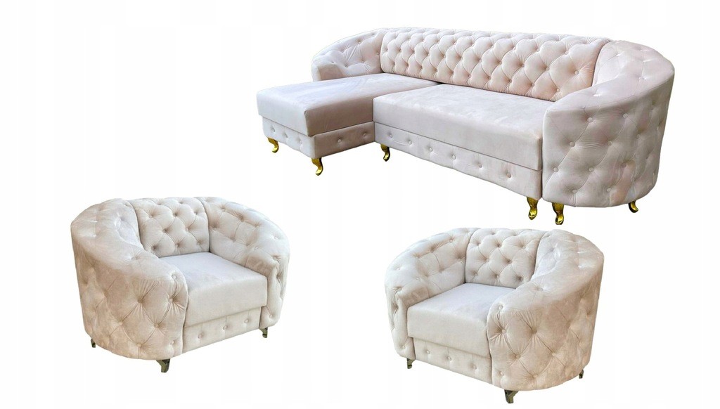 ZESTAW WYPOCZYNKOWY NAROŻNIK Z FOTELAMI GLAMOUR PIKOWANY FUNKCJA SPANIA