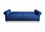 KANAPA PIKOWANA CLIO Z FUNKCJĄ SPANIA I POJEMNIKIEM NA POŚCIEL W KOLORZE NIEBIESKIM Z DREWNIANYMI NÓŻKAMI WZÓR PIKOWANIA OPARCIA KARO GUZIKI