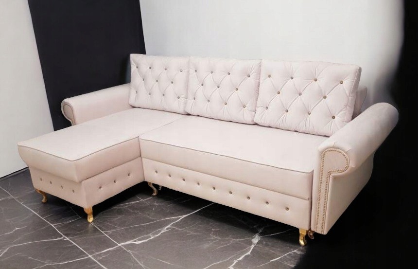 NAROŻNIK GLAMOUR PIKOWANY FUNKCJA SPANIA POJEMNIK NA POŚCIEL