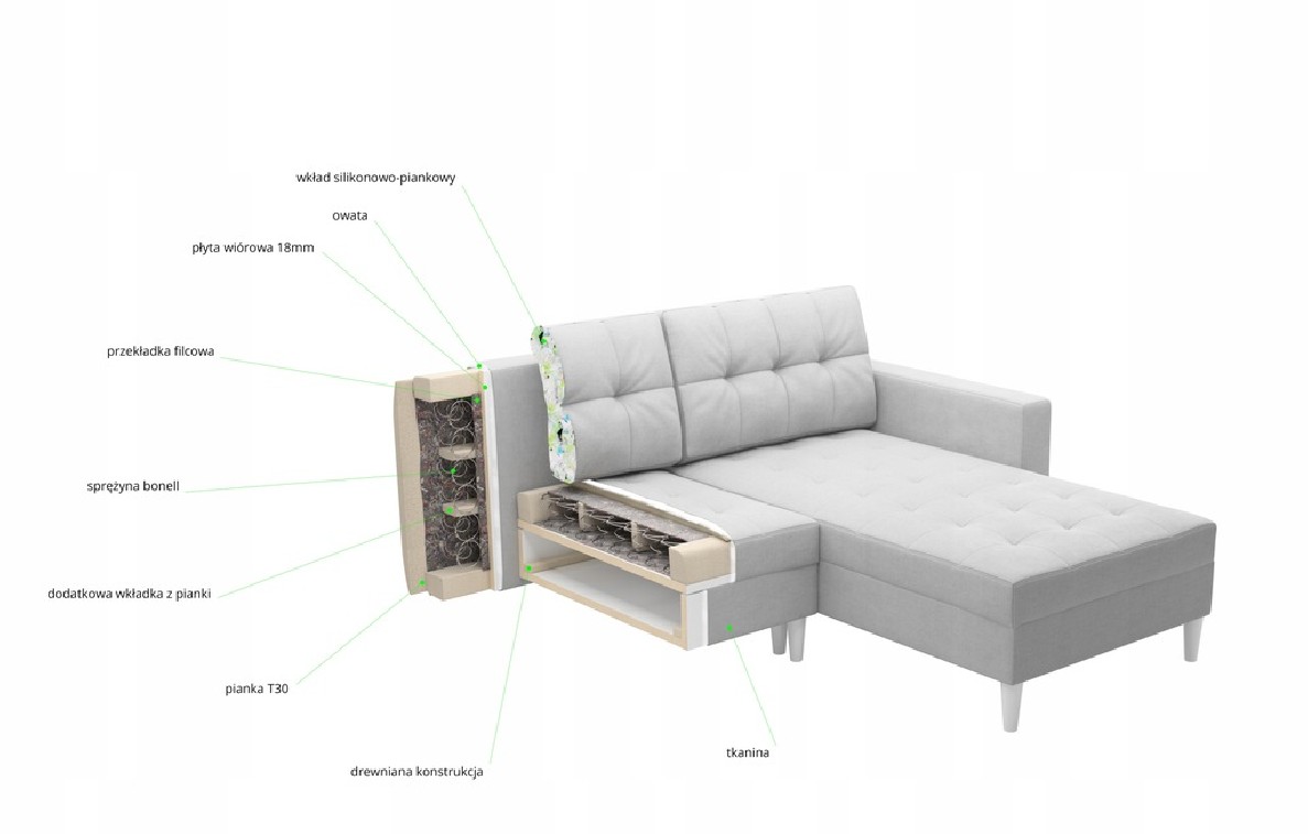 Narożnik wykonany został na sprężynach + pianka wysoko elastyczna typ T40.