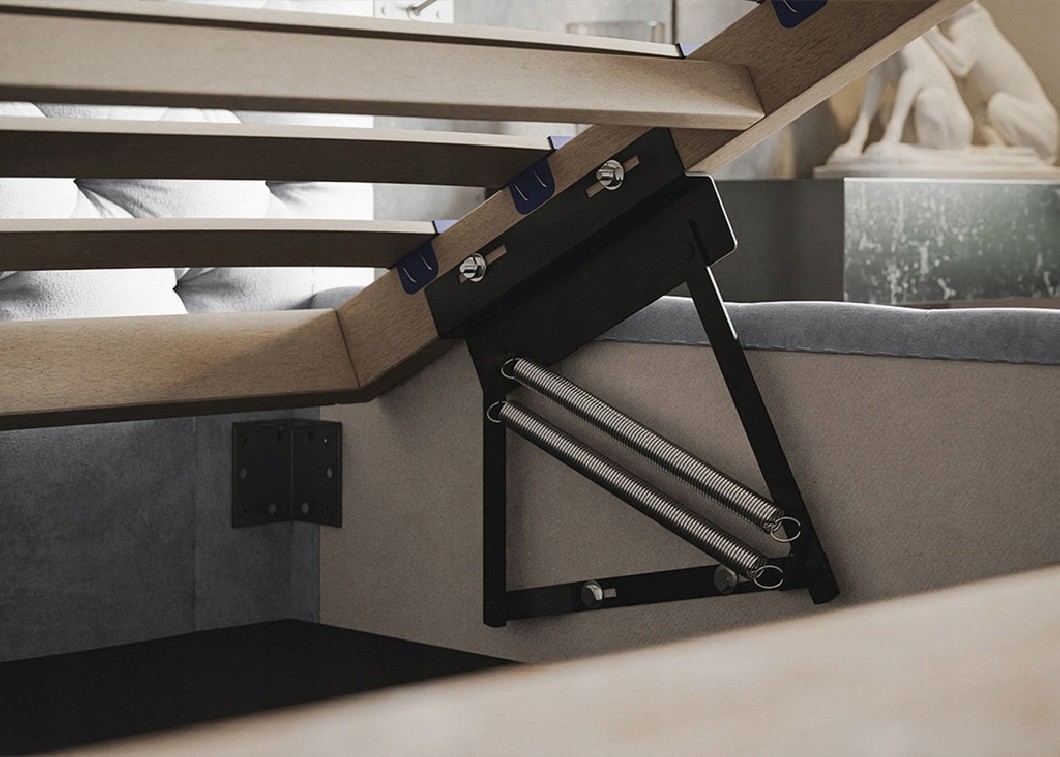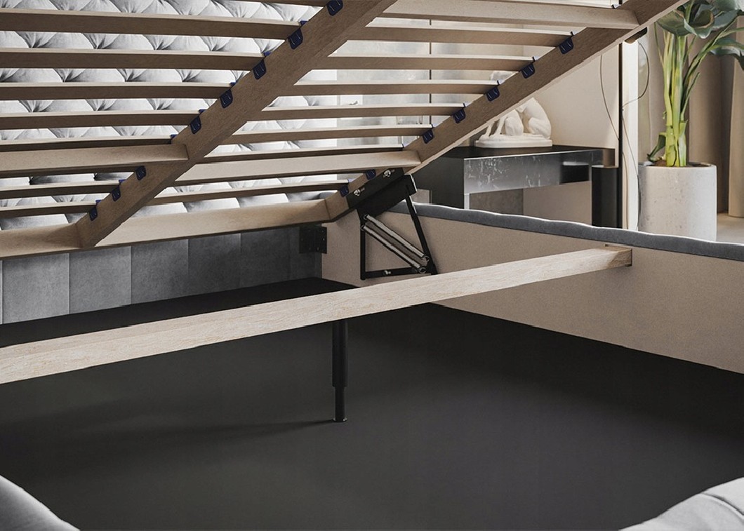 Stelaż drewniany z 32 elastycznymi listwami sprężynującymi gwarantuje odpowiednie podparcie dla materaca oraz komfort snu. Dodatkowo, dzięki podnośnikom sprężynowym, łatwo dostaniesz się do schowka pod łóżkiem, co sprawia, że jest to rozwiązanie nie tylko eleganckie, ale i funkcjonalne.