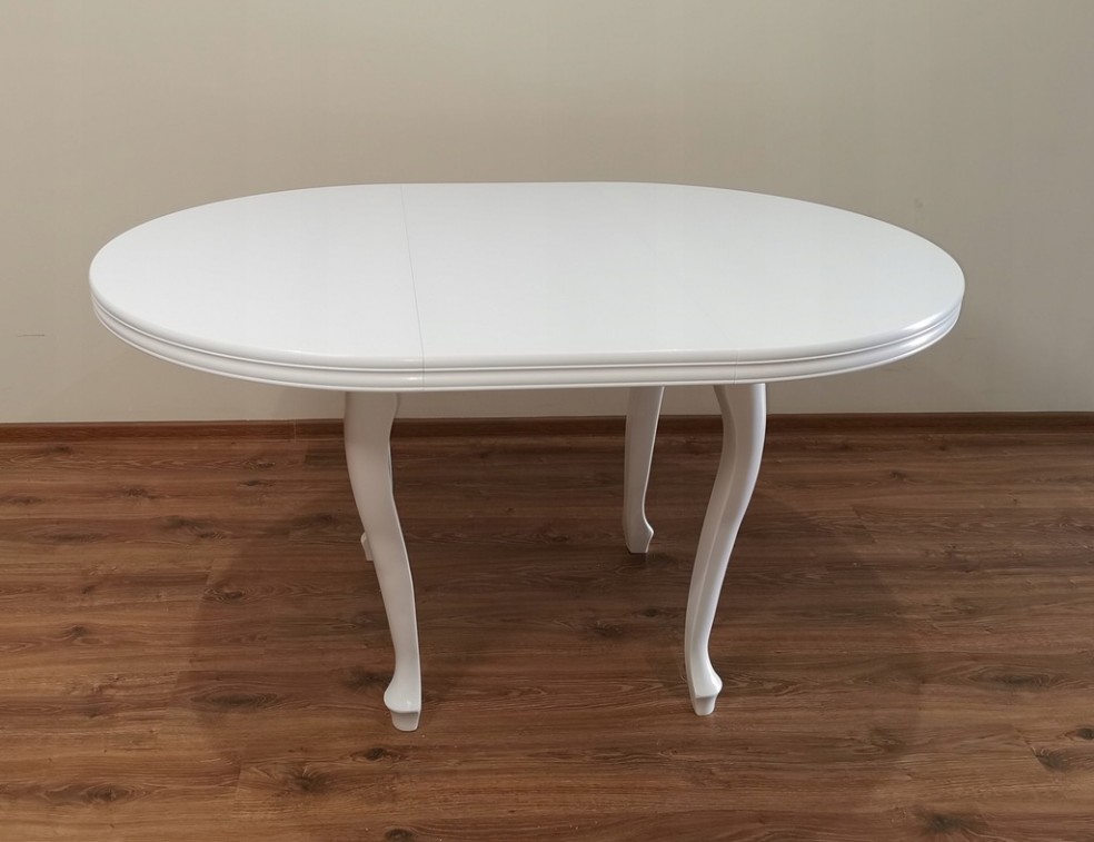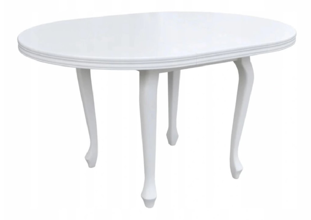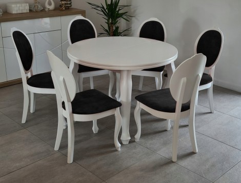 BIAŁY ZESTAW W STYLU LUDWIKOWYM STÓŁ OKRĄGŁY ROZKŁADANY MS-3 LUDWIK 100cm+1x40 cm wkładka długość po rozłożeniu 140cm i 6 krzeseł z litego drewna bukowego JULIA.