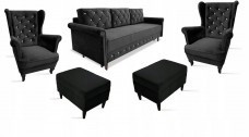 ZESTAW WYPOCZYNKOWY W STYLU SKANDYNAWSKIM LILI GLAMOUR PIKOWANY GUZIKAMI SOLIDNA SOFA ROZKŁADANA 3 OSOBOWA Z FUNKCJĄ SPANIA ORAZ PRAKTYCZNYM POJEMNIKIEM NA POŚCIEL ORAZ SYSTEMEM UŁATWIAJĄCYM ROZKŁADANIE DL + 2 FOTELE USZAK Z PODNÓŻKAMI Z DREWNIANYMI PROSTYMI NÓŻKAMI.