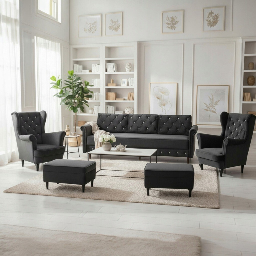 ZESTAW WYPOCZYNKOWY SOFA + 2 FOTELE PIKOWANE PODNÓŻKI SALON