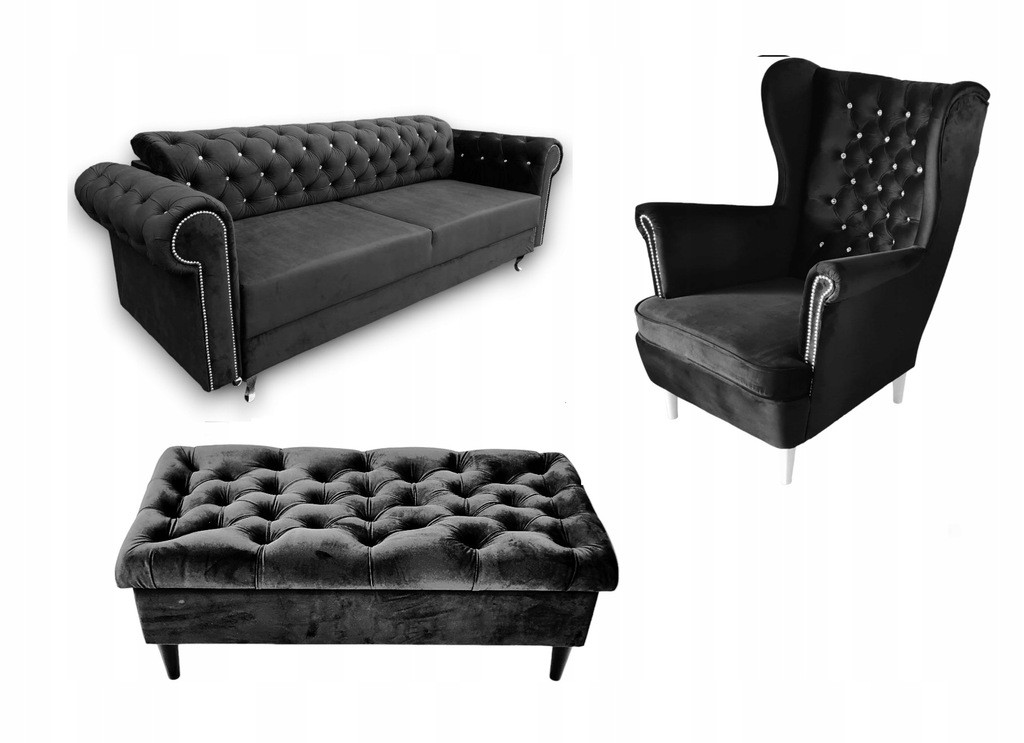 ZESTAW WYPOCZYNKOWY KOMPLET SOFA FOTEL PODNÓŻEK PIKOWANY SALON