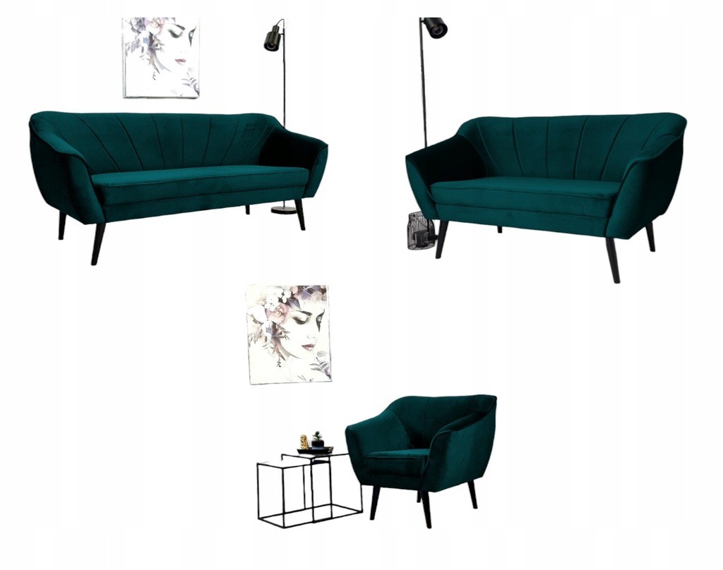 SOLIDNA SOFA 3 + 2 +1 W KOLORZE ZIELONYM Z DREWNIANYMI CZRNYMI NÓŻKAMI WZÓR PIKOWANIA OPARCIA PASY