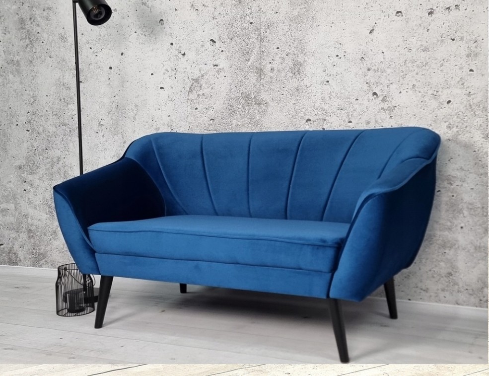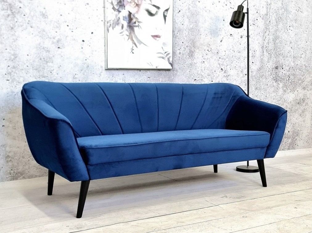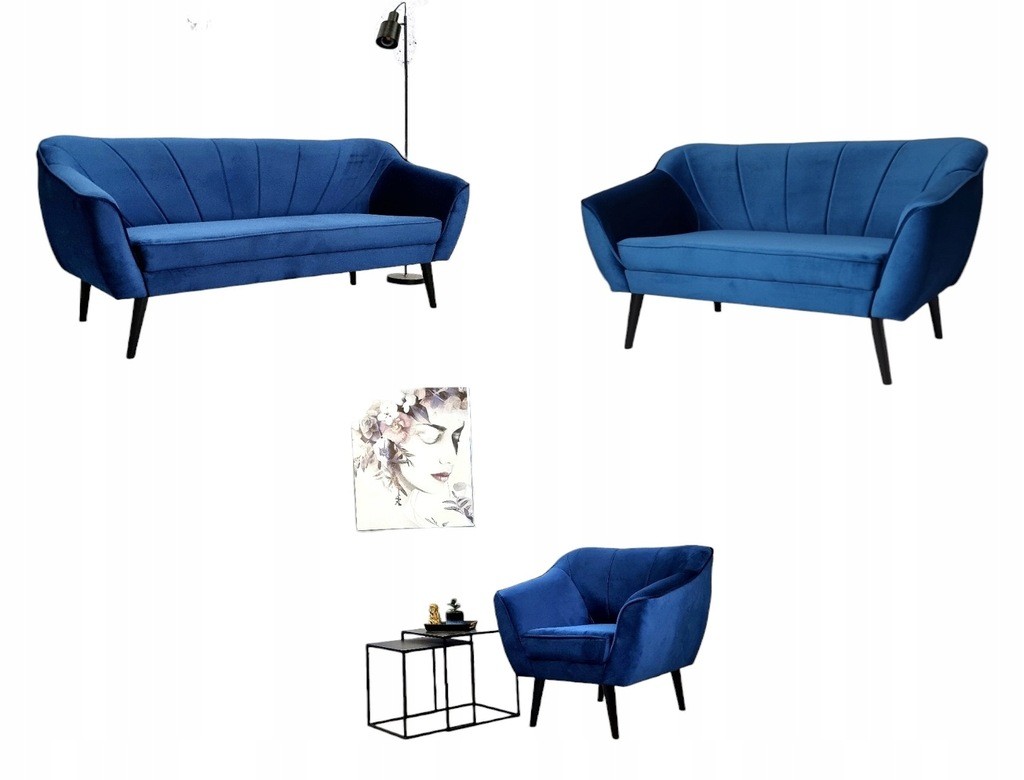 SOLIDNA SOFA 3 + 2 +1 W KOLORZE NIEBIESKIM Z DREWNIANYMI CZRNYMI NÓŻKAMI WZÓR PIKOWANIA OPARCIA PASY