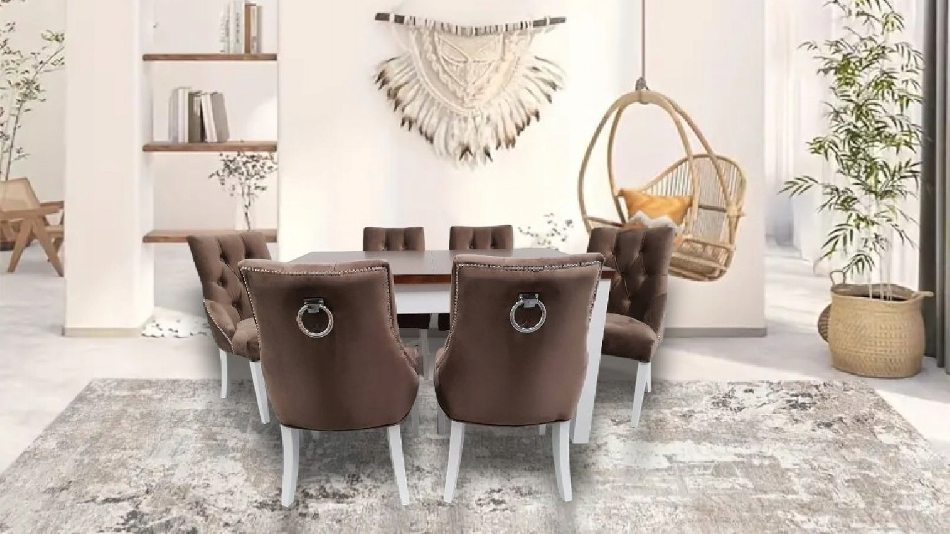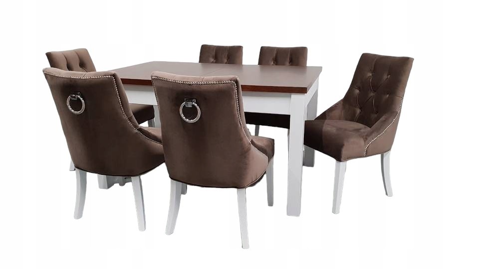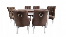 ZESTAW DO SALONU GLAMOUR Stół Rozkładany MST-8 80x140/180 +1x40cm długość po rozłożeniu 180cm i 6 krzeseł tapicerowanych KARINE ze srebrną kołatką i pinezkami w stylu GLAMOUR
