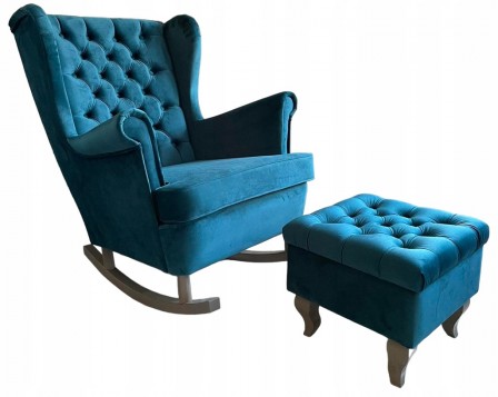 FOTEL USZAK BUJANY GŁĘBOKO PKOWANY NA PŁOZACH DREWNIANYCH GLAMOUR CHESTERFIELD + PODNÓŻEK CHESTERFIELD GŁĘBOO PIKOWANY ZE SCHOWKIEM OTWIERANYM DO GÓRY