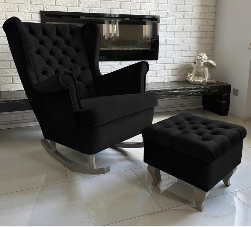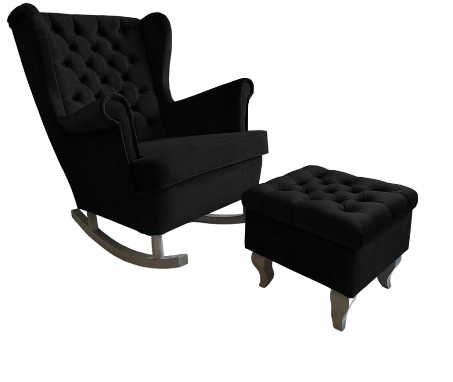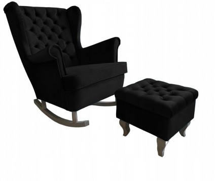 FOTEL USZAK BUJANY CZARNY NA PŁOZACH DREWNIANYCH GLAMOUR Z PODNÓŻKIEM