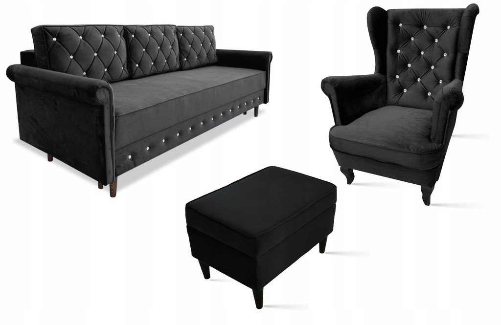 ZESTAW WYPOCZYNKOWY W STYLU SKANDYNAWSKIM LILI GLAMOUR PIKOWANY GUZIKAMI SOLIDNA SOFA ROZKŁADANA 3 OSOBOWA Z FUNKCJĄ SPANIA ORAZ PRAKTYCZNYM POJEMNIKIEM NA POŚCIEL ORAZ SYSTEMEM UŁATWIAJĄCYM ROZKŁADANIE DL + FOTEL USZAK Z PODNÓŻKIEM Z DREWNIANYMI PROSTYMI NÓŻKAMI.