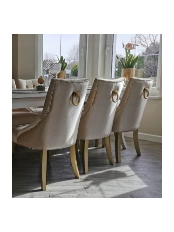 ZESTAW GLAMOUR Stół Rozkładany BIAŁY LUDWIK MST-8 100x250/350 +2x50cm długość po rozłożeniu 250/350cm i 8 krzeseł tapicerowanych KARINE ze złotą kołatką i pinezkami w stylu GLAMOUR