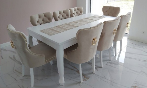 PIĘKNY ZESTAW GLAMOUR Stół rozkładany BIAŁY LUDWIK MST-8 100x250/350 +2x50cm długość po rozłożeniu 300/350cm i 8 krzeseł tapicerowanych ze złotą kołatką i pinezkami w stylu GLAMOUR MADAME .