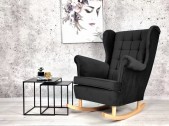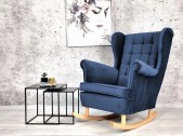 FOTEL BUJANY NA BIEGUNACH MALAGA USZAK Z DREWNIANYMI PŁOZAMI WZÓR PIKOWANIA OPARCIA PRZESZYCIA WCIĄGI