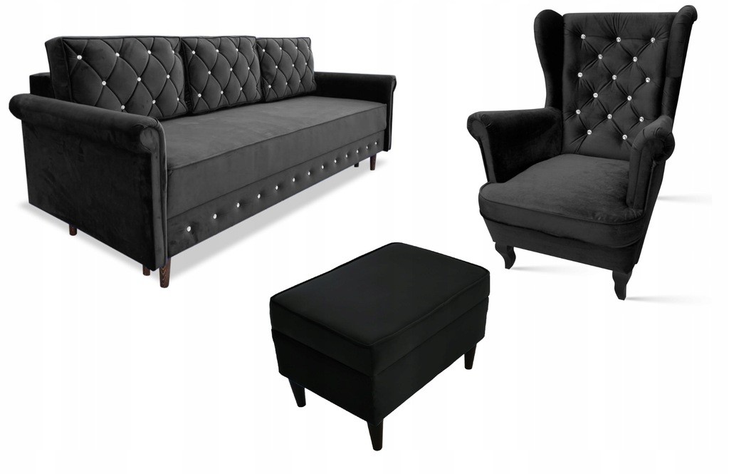 ZESTAW SKANDYNAWSKI LILI GLAMOUR PIKOWANY GUZIKAMI SOLIDNA SOFA ROZKŁADANA 3 OSOBOWA Z FUNKCJĄ SPANIA ORAZ PRAKTYCZNYM POJEMNIKIEM NA POŚCIEL ORAZ SYSTEMEM UŁATWIAJĄCYM ROZKŁADANIE DL + FOTEL USZAK Z PODNÓŻKIEM Z DREWNIANYMI PROSTYMI NÓŻKAMI.