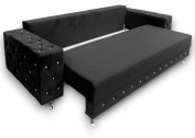 KANAPA SKANDYNAWSKA PIKOWANA VIVIEN Z FUNKCJĄ SPANIA I PRAKTYCZNYM POJEMNIKIEM NA POŚCIEL W KOLORZE CZARNYM Z PROSTYMI DREWNIANYMI NÓŻKAMI WZÓR PIKOWANIA OPARCIA KARO GUZIKI.